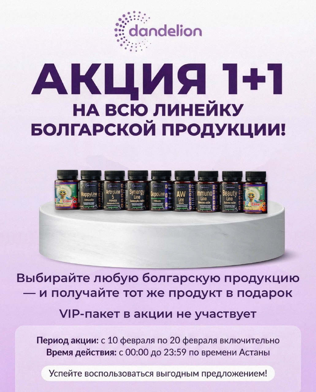 С 10 по 20 февраля включительно — двойная выгода для вас! 💥 Готовитесь к праздникам или просто хотите побаловать себя? Тогда это предложение именно для вас! 👉 Выбираете любую болгарскую продукцию, будь то инновационные добавки для здоровья или эксклюзивные косметические средства, 🎁 И получаете тот же самый продукт в подарок! ⏰ Период действия акции: с 00:00 до 23:59 по времени Астаны – успейте воспользоваться выгодным предложением! ❗ Важно: — подарок предоставляется идентичный выбранному продукту, например, при покупке одного флакона средства для суставов вы получаете второй такой же в подарок. — VIP-пакет в акции не участвует, так как уже содержит эксклюзивные предложения. Не упустите шанс взять больше на выгодных условиях, запасайтесь любимыми продуктами и экономьте! — количество товаров, участвующих в акции, ограничено. Поторопитесь! 🚀💜 Порадуйте себя и своих близких высококачественной болгарской продукцией! Спешите, акция действует всего 10 дней!