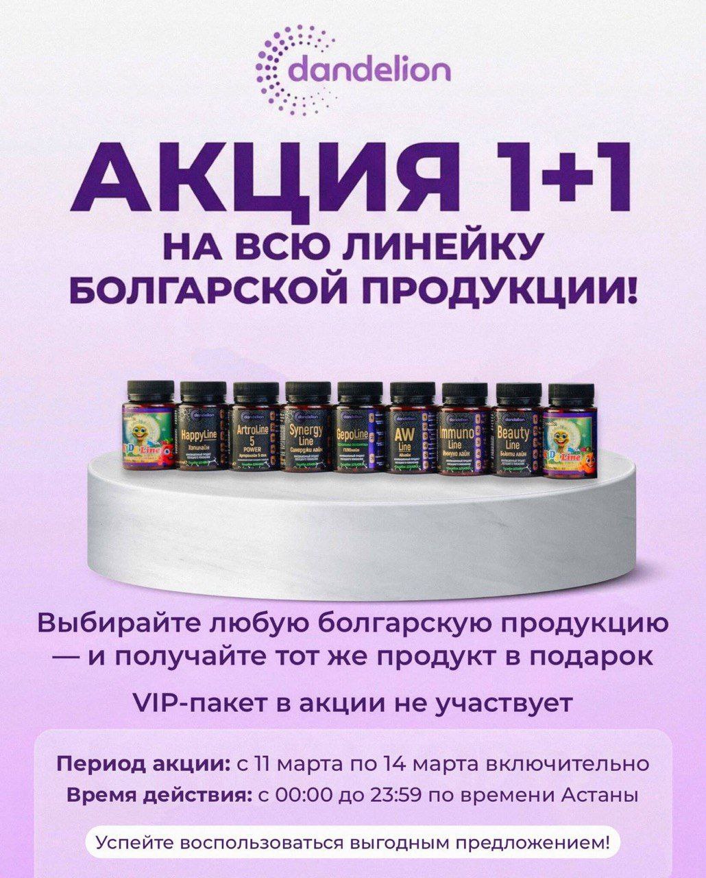 Новая акция от компании! С 11 по 14 марта действует акция 1+1 на всю линейку болгарской продукции. Покупаете 1 продукт — второй такой же получаете в подарок. Можно выбирать любой продукт из болгарской линейки: HappyLine, ArtroLine, SynergyLine, GepoLine, AW Line, Immuno Line, Beauty Line, Kids Line. Это отличный шанс попробовать новые продукты или запастись любимыми! Например, приобретая бальзам для суставов ArtroLine, вы получаете второй такой же совершенно бесплатно. Или, покупая витамины для детей Kids Line, вы заботитесь о здоровье малыша и получаете приятный бонус. Не упустите возможность воспользоваться выгодным предложением! Важно: VIP-пакет в акции не участвует. Условия акции распространяются на все товары болгарского производства, представленные в нашем ассортименте. Количество товаров ограничено. Спешите, чтобы успеть воспользоваться выгодным предложением!