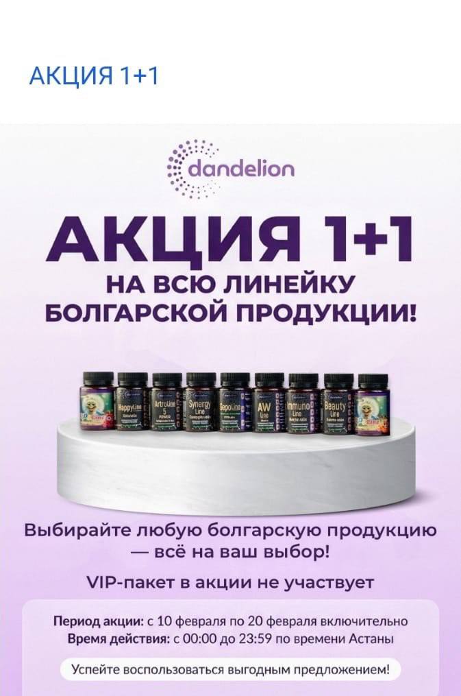 🔥АКЦИЯ 1+1 от Dandelion 🔥2 по цене 1 го 🔥 С 10 по 20 февраля действует акция 1+1 на всю болгарскую линейку продукции 🔥🔥🔥🔥 Оплачиваете один продукт — второй получаете в подарок 🎁 ✔ Выбирайте любые позиции ✔ Подходит для личного пользования и рекомендаций ⛔VIP-пакет в акции не участвует ⌚Акция действует СЕГОДНЯ с 21:59 до 23:59 мск 20 февраля 🎉🎉🎉 Не откладывайте — такие предложения бывают нечасто. Используйте момент 💛 Почувствуйте прилив энергии и насладитесь качеством болгарской косметики Dandelion! Например, при покупке крема для лица, второй такой же или любой другой продукт из линейки (сыворотка, тоник, бальзам для губ) достанется вам совершенно бесплатно. Это отличная возможность попробовать новые продукты или запастись любимыми. Акция распространяется на все товары, представленные в каталоге, за исключением VIP-пакетов, так как они уже включают в себя специальные предложения. Успейте воспользоваться выгодным предложением! Спешите, ведь времени осталось совсем немного!