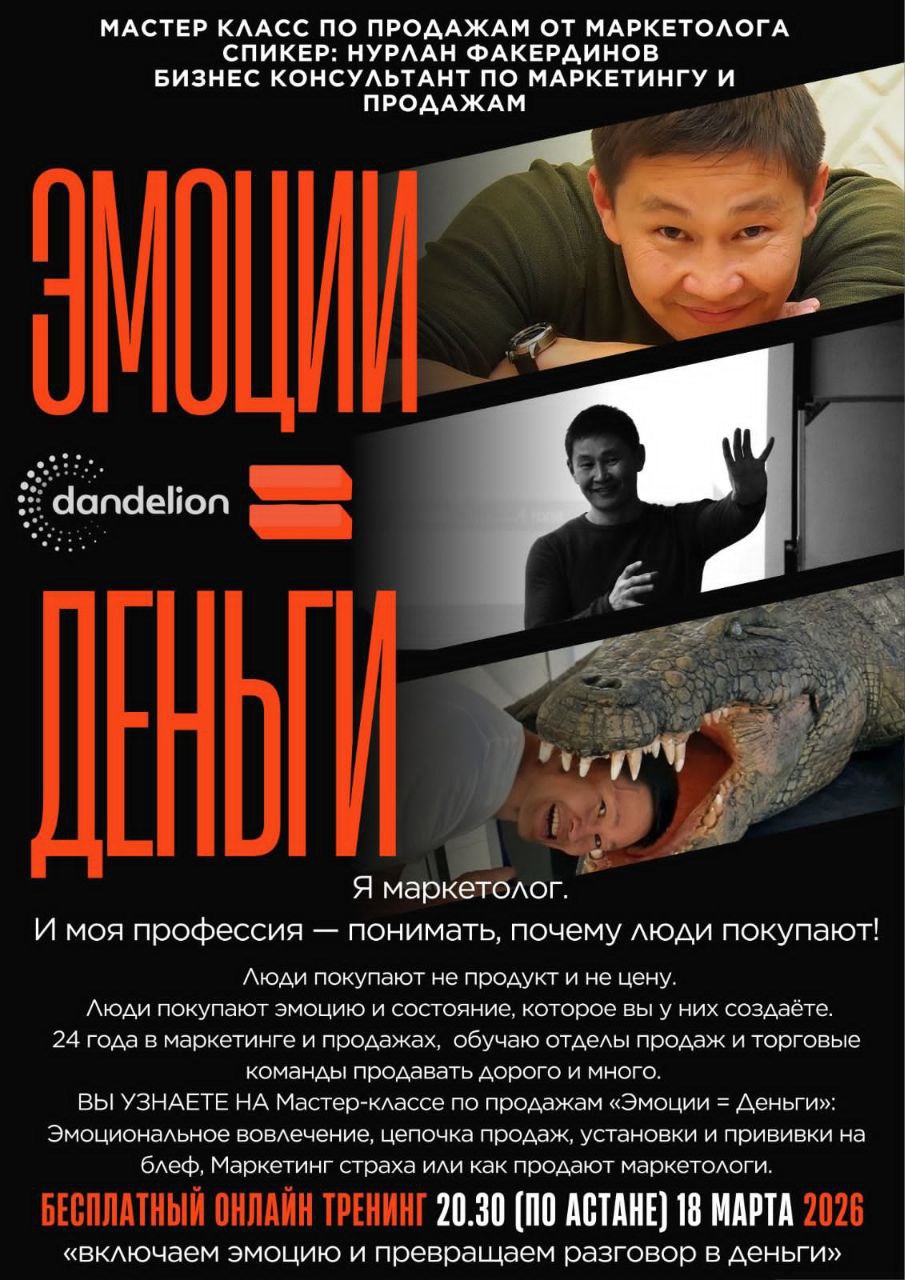 Приглашаем на практический мастер-класс о том, как люди принимают решение о покупке и как на это влиять. На встрече разберём: — как захватывать внимание партнёра или клиента — почему люди говорят «я подумаю» и как менять это на решение — какие эмоции запускают покупку — как выстроить продажи так, чтобы клиенты возвращались снова без скидок 💼 Спикер — Нурлан Факердинов — 24 года в маркетинге и продажах — обучает отделы продаж продавать дорого и без скидок Если хотите перестать просто рассказывать о продукте и начать влиять на решения клиентов, этот мастер-класс для вас. 📅 18 марта (среда) ⏰ 20:30 по Астане 📍 Онлайн, Zoom 💰 Участие бесплатное 🔗 Подключение: