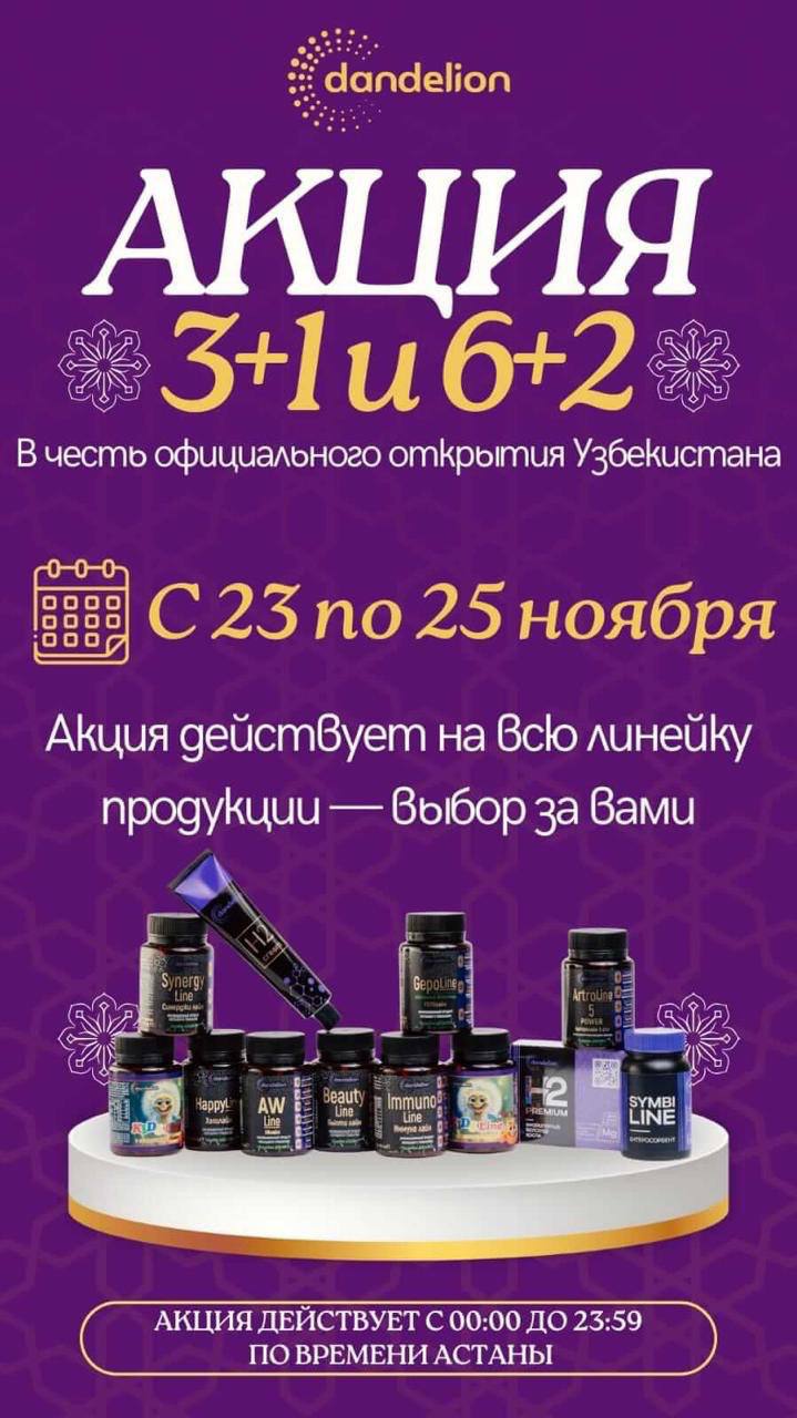 🔥ДОЛГОЖДАННАЯ ЩЕДРАЯ АКЦИЯ!🔥 В честь официального открытия Узбекистана 3+1 и 6+2 на всю линейку продукции Dandelion!👍 УЖЕ ДЕЙСТВУЕТ — успеваем 🎉 С 23 по 25 ноября — выбирайте любые продукты, формируйте свои наборы получайте подарки.🎁 Эта акция – ваш шанс попробовать больше продукции Dandelion или запастись любимыми товарами по выгодной цене! ✔️Акция действует для всех стран🎉: ✔️Оплати бизнес пакет и получи 1 шт в ПОДАРОК (итого 4 шт по цене 3) – идеальный вариант для знакомства с продукцией или небольшого личного запаса. Например, приобретая три упаковки нашего флагманского продукта, вы получаете четвертую в подарок, экономя значительную сумму. ✔️Оплати ВИП пакет и получи 2 шт в ПОДАРОК (итого 8 шт по цене 6) – отличный выбор для тех, кто хочет получить больше продукта и выгоднее приобрести его. Это позволяет поделиться продукцией с семьей и друзьями или использовать для демонстрации возможностей продукта. ✔️Оплати ВИП пакет в день регистрации и получи 3 шт в ПОДАРОК (итого 9 шт по цене 6) – самое выгодное предложение для новых партнеров! Это идеальный старт для построения своего бизнеса с Dandelion, позволяющий сразу же ощутить все преимущества нашей продукции. 💥💥💥Невероятная возможность для каждого — улучшить свое здоровье , помочь близким и присоединиться к быстрорастущей молодой компании 💥💥💥💥 Не упустите шанс! Продукция Dandelion – это инновационные решения для здоровья и красоты, основанные на натуральных компонентах. Присоединяйтесь к нашей команде, делитесь результатами и получайте доход!