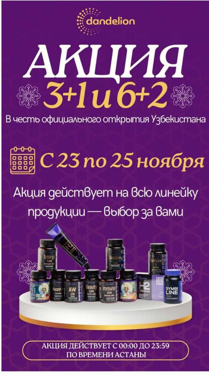 💥Добрый день, друзья!🔥 ⚠️ТОЛЬКО три дня с 23 по 25 ноября ✏️✏️✏️✏️✏️✏️✏️ На всю линейку Продукции Dandelion✏️✏️✏️ Покупаете🔤 3️⃣ — 1️⃣ один продукт в подарок. Покупаете 🔤 6️⃣ — 2️⃣ два продукта в подарок ✏️С 23 по 25 ноября — выбирайте любые продукты, формируйте свои наборы и получайте подарки. Кто успеет — тот заберёт максимум выгоды! 🔥 Акция действует с 00:00 23 ноября до 23:29 минут 25 ноября. Время Астаны.* ✏️По Москве акция действует с 22:00 22 ноября по 21:59 25 ноября✏️ 💥 Выгодно💥 Время действовать, время брать!!!🔥 АВАНГАРД — ВПЕРЕД ‼️ Не упустите шанс приобрести любимые товары Dandelion по выгодным ценам! Например, при покупке трех упаковок вашего любимого напитка для энергии, вы получаете еще одну в подарок! Или, если вы давно хотели попробовать всю линейку, приобретите шесть разных продуктов и получите два в подарок! Это отличная возможность запастись полезными продуктами для здоровья и красоты, или же сделать приятные подарки своим близким. Не забудьте, что количество подарков ограничено, поэтому спешите! Ознакомиться с ассортиментом и сделать заказ можно на нашем сайте или в Telegram канале. Успейте воспользоваться выгодным предложением! ⏳ Не упустите свой шанс!