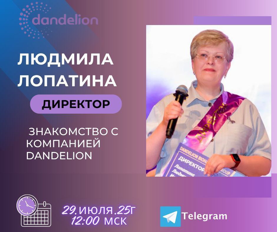 К сожалению сохранилась только в аудио формате. В эфире Людмила подробно рассказывала о деятельности компании, ее основных продуктах и услугах. Особое внимание было уделено истории Dandelion, ее миссии и ценностям. Людмила делилась своим опытом сотрудничества, отмечая преимущества работы с компанией и перспективы для партнеров. В аудиозаписи можно услышать ответы на вопросы слушателей, касающиеся ассортимента продукции, условий доставки и возможностей для заработка. Эфир был направлен на привлечение новых клиентов и партнеров, а также на повышение узнаваемости бренда. К сожалению, видеоверсия не сохранилась, но аудиозапись по-прежнему представляет интерес для тех, кто хочет узнать больше о Dandelion.